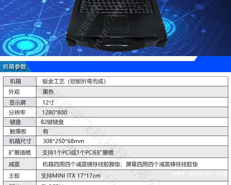 显示屏:12寸 分辨率:1208*800 键盘:工业键盘 触摸板:有 主板:支持17*17CM CPU:支持集成CPU 硬盘:MSATA、M.2 内存:DDR3/DDR4